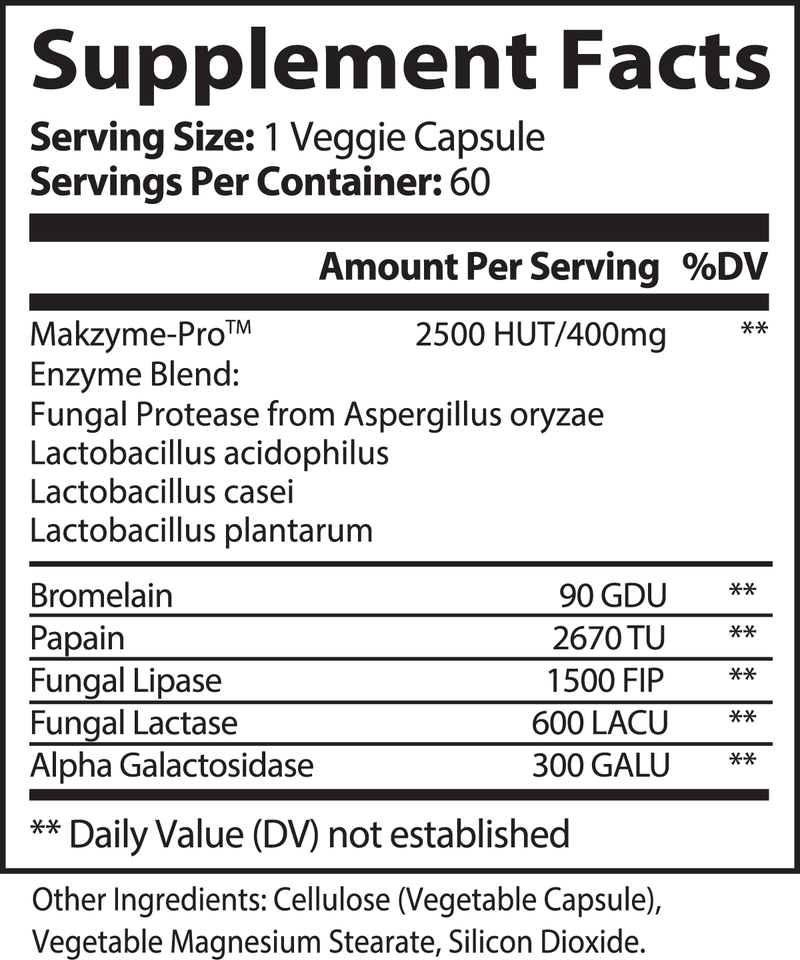 Ingredients: Makzyme-Pro™, Enzyme Blend (Fungal Protease from Aspergillus oryzae, Lactobacillus acidophilus, Lactobacillus cases, Lactobacillus plantarum), Bromelain, Papain, Fungal Lipase, Fungal Lactase, Alpha Galactosidase, Cellulose (Vegetable Capsule), vegetable Magnesium Stearate, Silicon Dioxide.